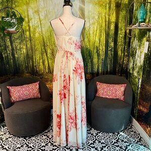 This elegant wrapdress from Lulu's is perfect for any occasion featuring a sleeveless design with delicate spaghetti straps. The dress showcases a harmonious blend of pink and cream hues, creating a romantic and ethereal look. Its flowing maxi silhouette adds a touch of sophistication to any special occasion. worn once to a wedding