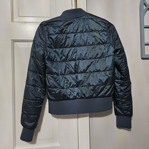 This green bomber jacket features a classic quilted design with ribbed collar, cuffs, and waistband for a snug fit. Its cropped length and padded appearance make it a stylish yet practical choice for cooler weather. The jacket's sleek and minimalistic design ensures it pairs effortlessly with various outfits.