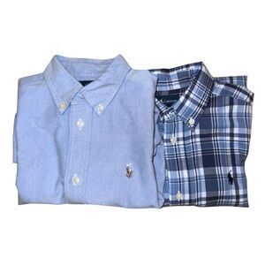 Elevate his wardrobe with these Ralph Lauren blue button-down shirts, one featuring a timeless plaid pattern, one feature a timeless solid blue. Crafted for comfort and style, this shirt is perfect for laid-back outings or smart-casual occasions. Its classic design ensures a versatile addition to any outfit.