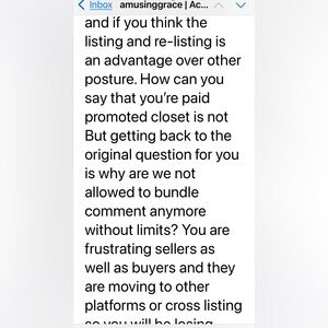 @amusinggrace this is ridiculous PM has a limit on Bundle messages!!! it often takes far more than 4 comments back and forth with a buyer depending upon the item etc... using Spam as their excuse for this is also ridiculous!! anyone can pretty much tell when they are being scammed/spammed or what have you, and stop the chat and report it and that is usually in less than 4 comments! PM needs to get their 💩 together and fix this ASAP! this will affect them big time if they don't!