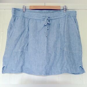 This casual skirt from Old Navy features a soft, linen/rayon blend chambray fabric in a light blue and white striped pattern. The drawstring waist ensures a comfortable fit, the deep cargo-style hip pockets offer convenience, and the notched side hems deliver casual style. This skirt is in Very Good secondhand condition. Measures 40” W, 17” L.