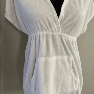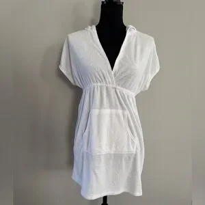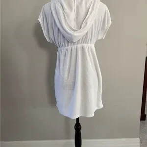 Chic white terry cloth cover-up with hood. Features a handy front pocket. Ideal for beach days. Cared for in my Smoke Free Home!