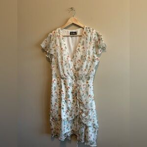 Gorgeous floral dress by Sam Edelman, a perfect dress for a spring or summer wedding. Beautiful flower details and a ruched waist with a tie. In excellent used condition, no flaws noted.