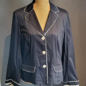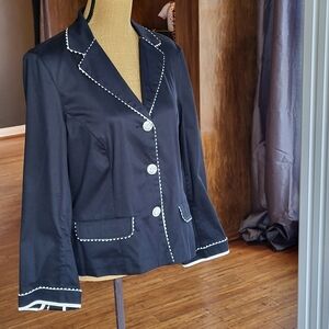Susan Bristol vintage black cotton unlined lightweight jacket with oversized pearlized buttons, notched lapel, and ivory sawtooth piping.