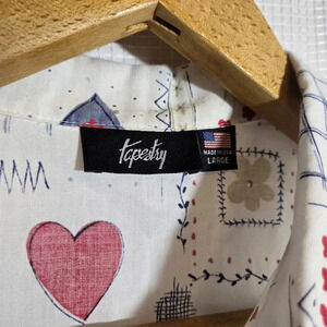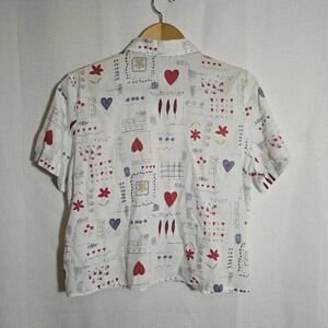 Charming button-down shirt with heart and floral patterns. Short sleeves. Perfect for casual wear.