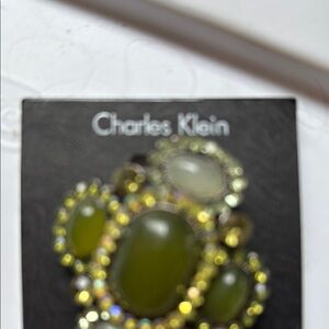 This elegant brooch features a striking green center stone set in a gold-toned metal, exuding a vintage charm. The detailed metalwork surrounding the stone adds a touch of sophistication, making it a timeless accessory for any occasion.