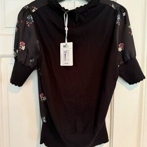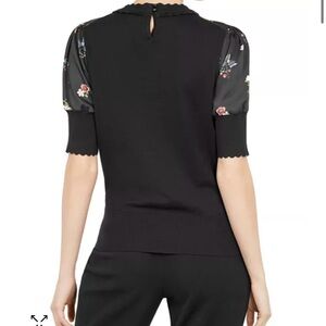 This elegant Ted Baker blouse features a fitted silhouette with a silk texture, crafted in a classic black floral hue. The short sleeves and delicate design make it a versatile addition to any wardrobe, perfect for both casual and formal occasions.