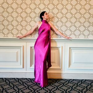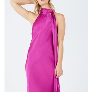 BCBGMAXAZRIA Halter Crepe Gown in Wild Aster color. Fashioned with a stretchy blend, a halter neck, a functional bow tie at the neck and a zipper. Stretchy blend designed for maximum comfort without compromising style.
