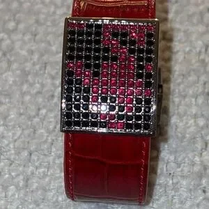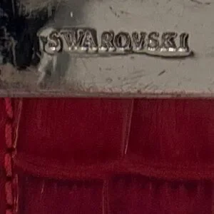 This Swarovski bracelet features a panel design with red and black crystals, accented with a silver-tone swan stamp. The bracelet is made of faux leather with a magnetic clasp for easy closure. It has a vintage touch and is signed by Swarovski, making it a stylish and collectible piece suitable for various occasions like engagements, Mother's Day, Christmas, weddings, anniversaries, birthdays, and more. The red and black color scheme adds a bold and elegant touch to the overall design, making it a statement accessory for any outfit.