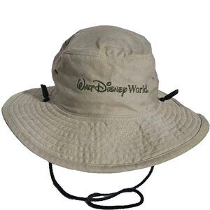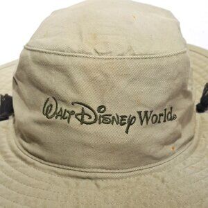 The product is a vintage 90s Walt Disney World bucket hat featuring Mickey Mouse surfing, with a chin drawstring for a secure fit. Made with a tan color and one-size design, this collectible item is suitable for adults and embodies the classic Disney franchise. This nostalgic piece from Taiwan is perfect for Disney fans looking to add a unique and retro accessory to their collection.