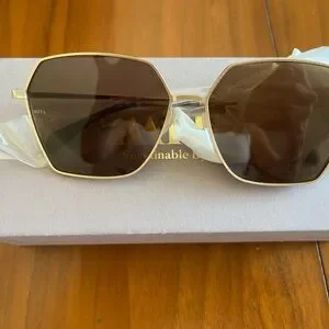 These sunglasses boast a striking geometric design with angular frames in a luxurious gold finish. The dark brown lenses offer excellent sun protection while adding a touch of elegance. Perfect for making a bold fashion statement, these accessories combine style and functionality effortlessly.