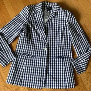 New without tag, navy blue/white single button closure plaid blazer, front pockets (sewn shut), back slit, striped lining, concealed shoulder pads, comes with an extra button, size 14T, no visible flaws