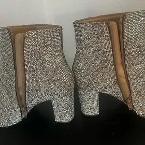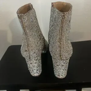 These Betsey Johnson ankle booties feature a dazzling silver finish adorned with glittering rhinestones, creating a striking and glamorous look. The sleek silhouette, pointed toe, and block heel make them perfect for special occasions, adding a touch of elegance to any outfit.
