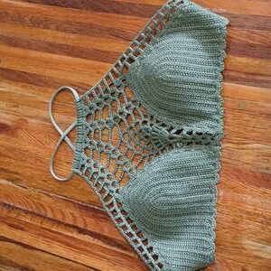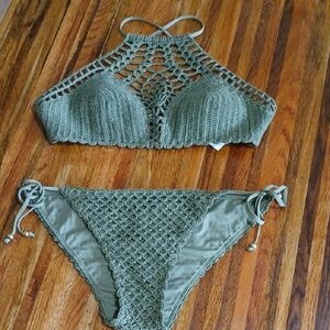Abercrombie & Fitch bikini. Olive green crochet. Top is size large with string tie back. Removal bra pads. Bottoms are size medium with side string ties.