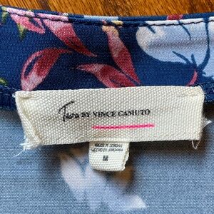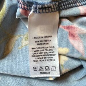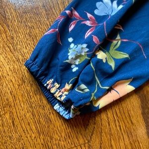 Print features peach/light orange, light and dark pink, and periwinkle/white flowers on a green vine all on a blue background.