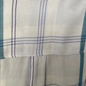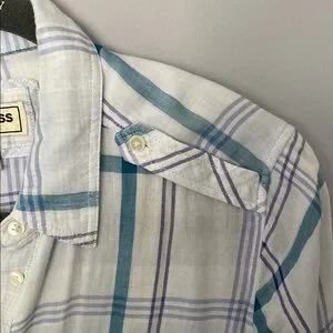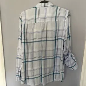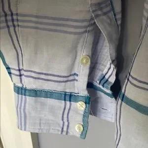Chic plaid pattern on light linen like fabric by Express. Features teal and white pattern and checkered lining. Includes buttoned chest pockets, button should straps, convertible button sleeves, and a classic collar. Some discoloration as pictured.