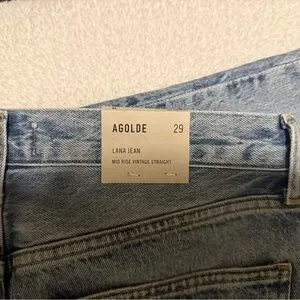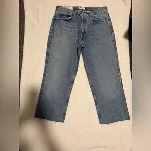 Agolde jeans in a light blue shade. Mid rise with a straight leg fit. Classic and versatile style. I cut them to be more of an ankle/crop fit. Measuring tape in pic.