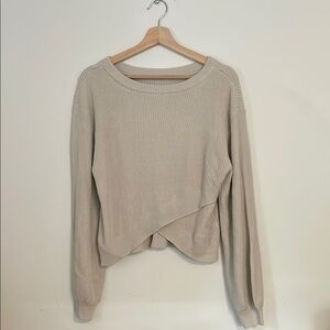 Embrace a modern minimalist style with this cream crew neck sweater from Lululemon Athletica. Featuring a unique twisted front design, this knit sweater offers a chic asymmetrical hemline and long sleeves for a cozy yet fashionable look.
