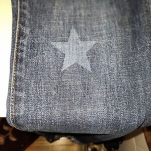 Trendy dark wash jeans with star patterns. Frayed hem for a stylish look. Perfect for casual wear.