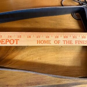Dark chocolate brown leather. This bag has one row of antique silver studs all around the front of the bag, magnetic snap closure, inside lining with zipper pockets and long strap.