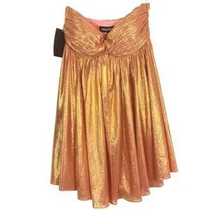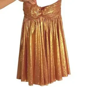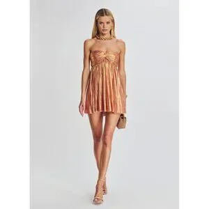 Enhance your soiree style with our Kaiser Dress. This strapless mini piece features a pleated bodice, coordinating skirt, and a bright metallic finish. Shown here in Apricot.