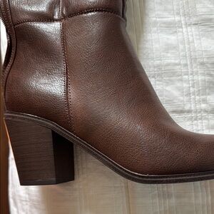 New, unworn BareTraps brown heeled boots, featuring a timeless design and a rich leather finish. These boots offer a perfect blend of style and comfort, making them an ideal choice for any occasion. The subtle variations in the brown leather add a touch of sophistication to your ensemble. There is a small scratch that’s not very noticeable on one shoe. However they were bought like this and never worn.