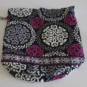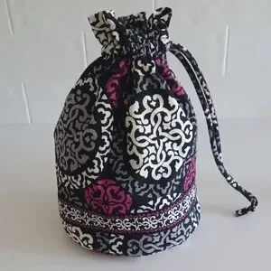 This is a Vera Bradley ditty bag with drawstring in the Canterberry Magenta pattern. Ditty bags are versatile, plastic-lined bags designed for various uses, including organizing small items, storing wet items like swimsuits, or carrying toiletries. They are often used for travel, as well as for everyday organization, and are known for their durable wipe-clean lining. This preowned bag is in very good condition. It measures approximately 13" tall from.the bottom.seam to the top edge and about 8" across, measuring the flat bottom seam. When laid flat, the piece measures about 12" across. Smoke free home.
