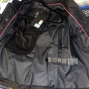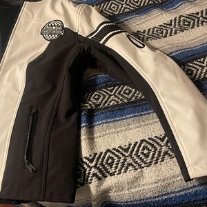 Sleek utility jacket with bold black and white design. Features zippered pockets and iconic branding. Perfect for versatile style.