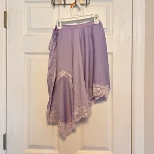 Soft, satin fabrication; stretchy elastic waistband, asymmetric hemline, lace detail throughout, flowy silhouette