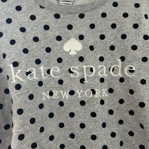 This elegant Kate Spade sweater features a classic crew neck design with a playful pattern of black polka dots on a gray base. The long sleeves and ribbed hem add a touch of sophistication, making it a versatile choice for casual outings.