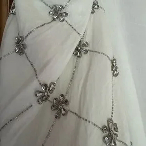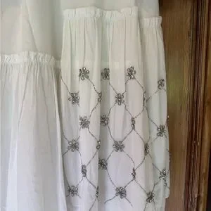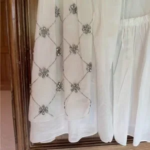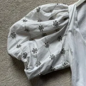 New dress, never been worn. This wrap dress is SO cute—the crystals sparkle so beautifully, the puff sleeves are so fun, and the cotton makes it light and breathable. It’s white with daisy crystal accents on the sleeves as well as parts of the skirt, and it’s very comfortable on. It sadly washes me out, but it’s so beautiful that I would love to find a new home for it where it will get lots of wear! Size small, I live in a smoke-free/pet-free home.