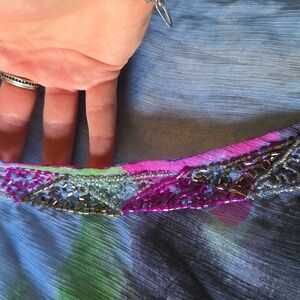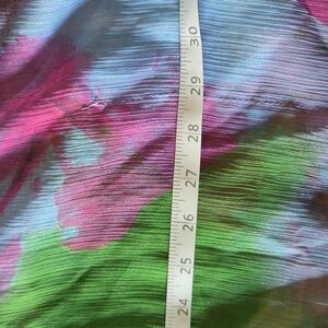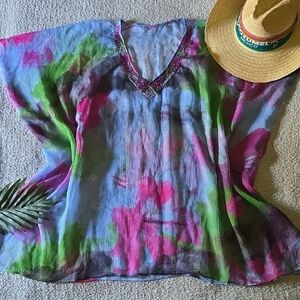 Great condition blue, purple/pink, and green floral patterned embellished swim coverup dress, women's one size. Tags were taken off, but it has never been worn. Unbranded, was bought on a cruise ship. Brand on the tag said "Cruise Club," but there is no brand on the dress itself. May have a few small snags due to the delicate nature of the material, not noticeable when wearing. Measurements are approximate as the flowy-ness and extra material on the sides make it difficult to measure. Fits similarly to a typical large or XL. Features an embellished/beaded neckline, side slits, and a draped flowy fit. Pattern is reminiscent of the famous Claude Monet's "Water Lilies" painting