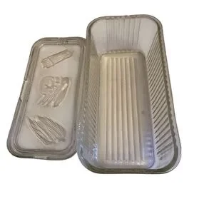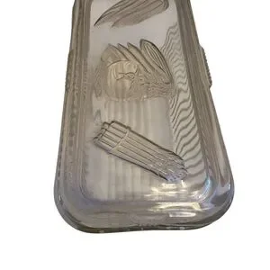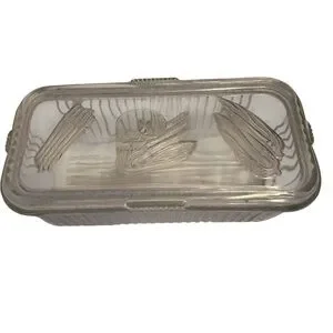 The product is a set of two vintage Federal Glass clear refrigerator storage dishes with lids, designed for storing vegetables. These square-shaped covered dishes are made of pressed glass and feature a single compartment. The set includes a total of four items, with a classic clear color that adds a touch of elegance to any kitchen or dining room. Made in the USA, these dishes are a functional and stylish addition to any collection of decorative cookware, dinnerware, and serveware.