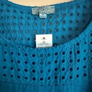 Stylish blue linen dress featuring eyelet detail on the neckline. Perfect for casual outings. A pocket on both sides. AS IS new, never worn