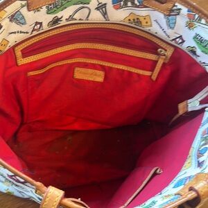Chic Dooney & Bourke tote with Hollywood-themed print. Features sturdy brown handles. Ideal for everyday use.