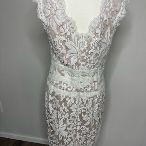 This exquisite Tadashi Shoji dress is perfect for a bride, featuring a sleeveless sheath silhouette in a soft cream color. The sweetheart neckline adds a touch of romance, while the intricate lace detailing throughout the dress enhances its elegance. Ideal for a memorable wedding day, this dress combines classic charm with modern sophistication.