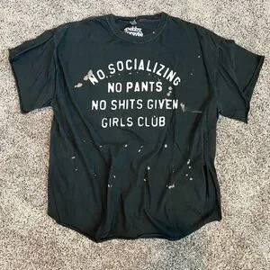 Embrace a rebellious vibe with this side slit black tee, featuring a bold white graphic and a distressed, vintage look. The relaxed fit and short sleeves make it perfect for casual outings, while the striking text adds a touch of attitude. Love it, but need to clean out my closet. Size xl. Gently loved.