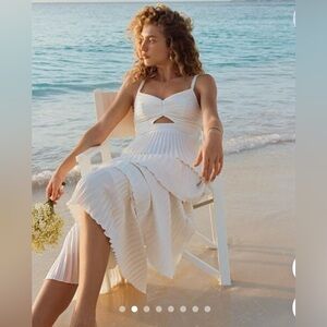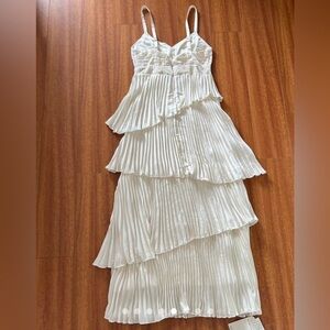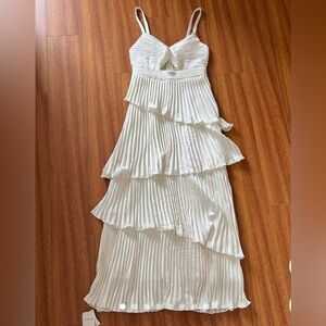 Stunning cream maxi dress with pleated layers. Features a stylish cut-out design.