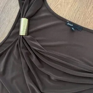 Chaus Brown Sleeveless Top with Gold Trim Accents on Shoulder. Women’s Size Med. Excellent Condition with the exception of some minor tarnishing to the gold accents. Great top to dress up or down with jeans, or to layer with a jacket or cardigan.