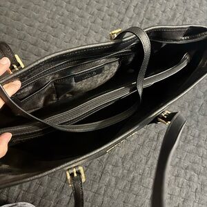 This Michael Kors tote bag in black leather exudes sophistication with its structured design and gold-toned hardware. Crafted from high-quality leather, it offers both durability and a sleek appearance, making it a perfect blend of style and practicality.