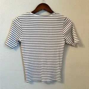 This chic tee from Pact features a classic black and white color scheme with a fitted silhouette and a stylish 3/4 button up. The short sleeves and buttoned design make it a versatile addition to any wardrobe, perfect for both casual and smart-casual occasions. Size Small.