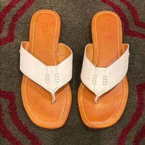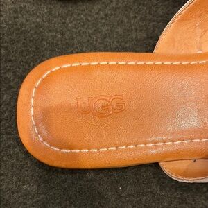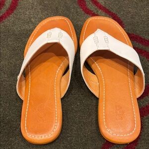 Chic UGG sandals with white straps. Comfortable tan footbed. Ideal for casual wear. Worn as shown.