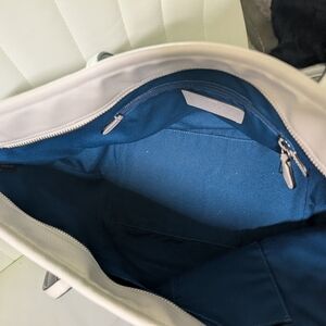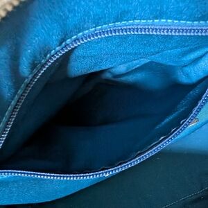 Solid blue lining w/ 1 zippered pocket & 2 open pockets Zippers & tabs all good. Clean inside & out. In excellent condition from non smoking home. No tears, stains, scratches.