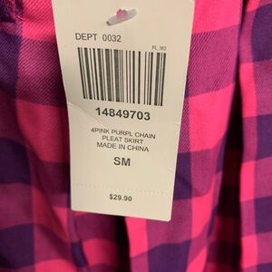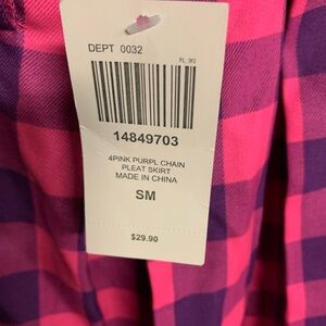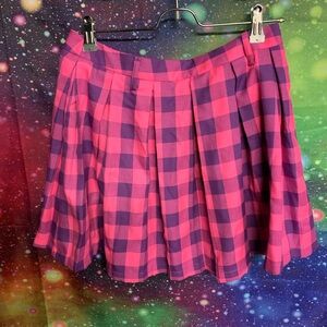 This vibrant mini skater skirt features a bold plaid pattern in hot pink and black, creating a striking visual effect. The pleated design adds volume and movement, making it a fun and fashionable choice for casual outings.