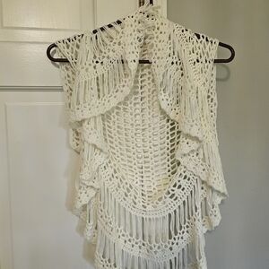 Elegant ivory crochet vest featuring fringe accents. Ideal for layering.