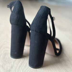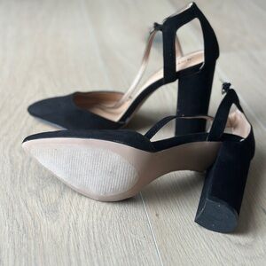 A pointed-toe block-heeled pump with side cutouts and a buckle closure.