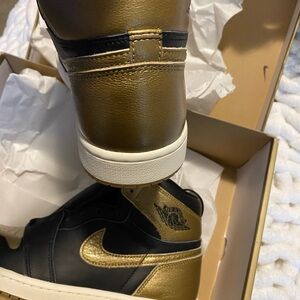 Elevate your look with these Nike high-tops. Sleek black with bold gold accents. Ideal for style and comfort.