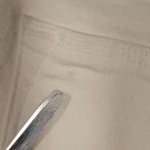 One light blue, tiny dot on the rear pocket. No other stains or marks found.