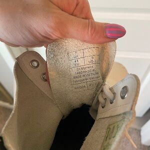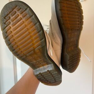 These Dr. Martens combat boots in white feature a classic lace-up design with metal eyelets and a chunky black rubber sole. The smooth leather upper and ankle-high height offer a striking two-tone look, combining durability with a stylish edge.