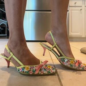 Step into elegance with these floral embellished slingback heels. Featuring a vibrant mix of colors and a charming pink bow, these shoes are perfect for any occasion. Brand new!